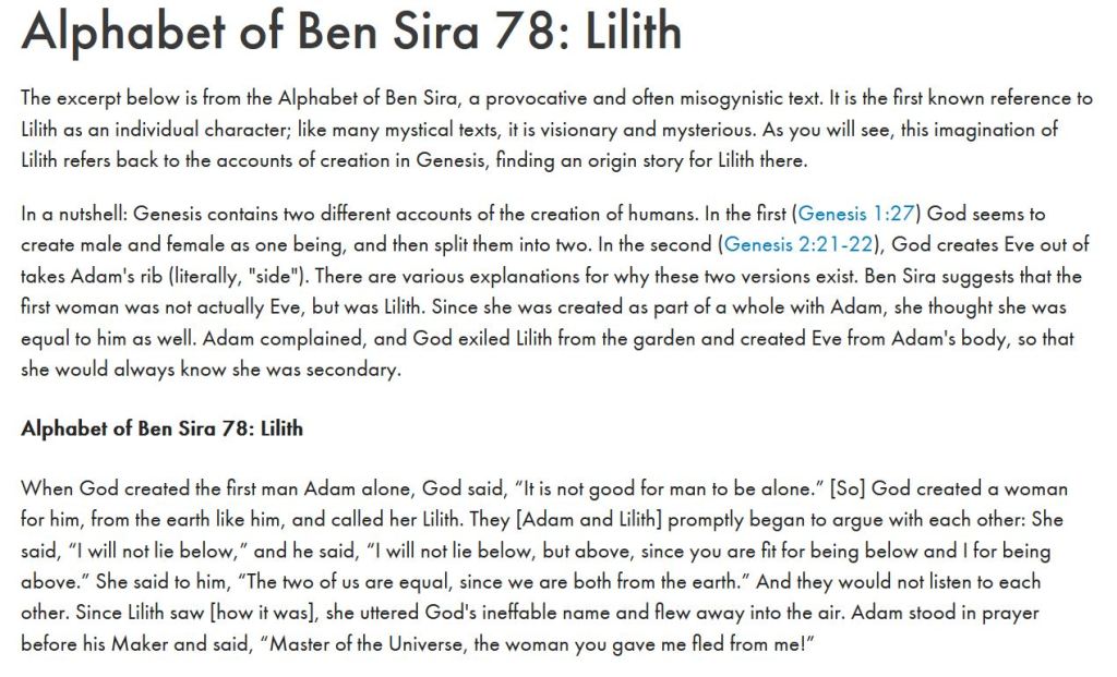 Gott schuf also Adam und Lilith, und es gab Streit. Lilith entschloss sich, Adam zu verlassen, und entflog, um sich in der Wüste niederzulassen. Seitdem wirkt sie als Dämonin, die Männern, Frauen (vor allem Schwangeren und Wöchnerinnen) und Kindern (vor allem Säuglingen) gefährlich werden kann – und das vor allem in den Nächten. Gott aber schuf mit Eva eine zweite Frau für Adam aus dessen Rippe. Weil sie damit ein Teil von Adam war, ordnete sie sich klaglos unter.