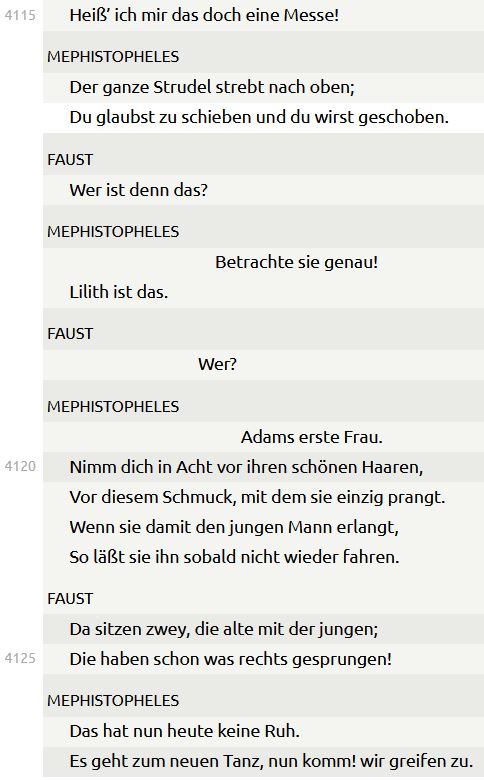 In Goethes „Faust 1“ taucht Lilith übrigens ebenfalls auf, und zwar als Hexe in der Walpurgisnacht-Szene: