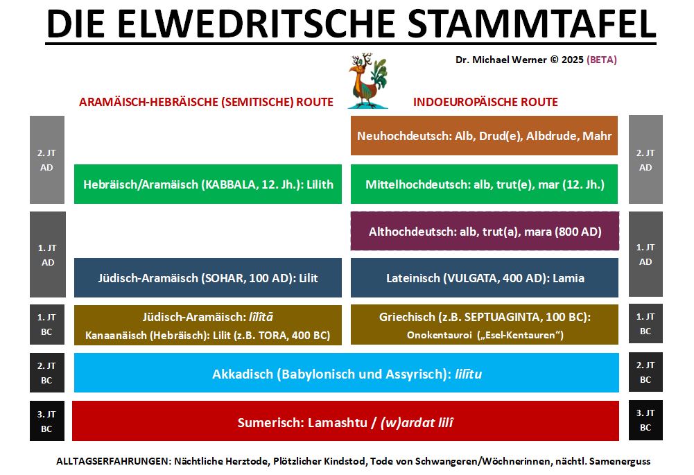 Wenn man dem allem folgt, hat die Elwedritsch gleich zwei Wurzeln: eine indoeuropäische und eine hebräisch-aramäische (semitische) Wurzel. Im Indoeuropäischen breitete sich das Konzept eines nächtlichen Schad-Dämons zum Einen nach Kulturkontakt mit mesopotamischen Kulturen mit den Wanderungsbewegungen der bäuerlichen Gesellschaften nach Westen und Osten aus. Zum Anderen wurde das Konzept über Bibelübersetzungen ins Griechische (Septuaginta) bzw. Lateinische (Vulgata) indoeuropäischen Gesellschaften – Griechen und Römern – zugänglich. Diese Texte aber gehen letztlich auf jüdische (hebräische, aramäische) Überlieferungen zurück.